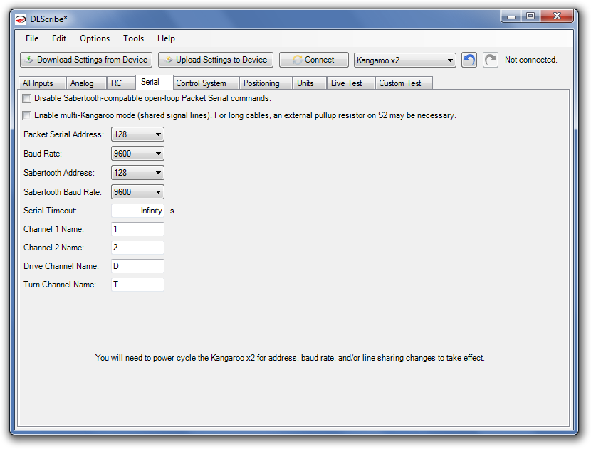 As far as Packet Serial data integrity goes, Kangaroo packets are protected by a 14-bit CRC, while Sabertooth packets are protected by a 7-bit checksum. Kangaroo understands both. If you require maximum resilience to signal corruption and do not need Sabertooth open-loop command support, this option lets you turn it off.