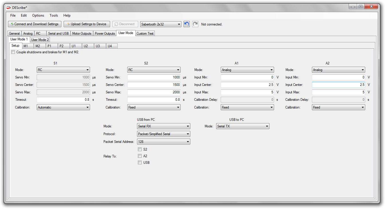 Check this if you want a shutdown set on M1 to also shut down M2, and vice versa. Brakes will also be linked. This is desirable especially for differential drive applications of User Mode.